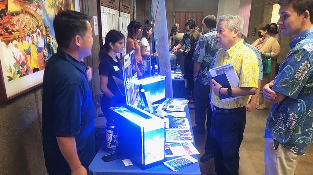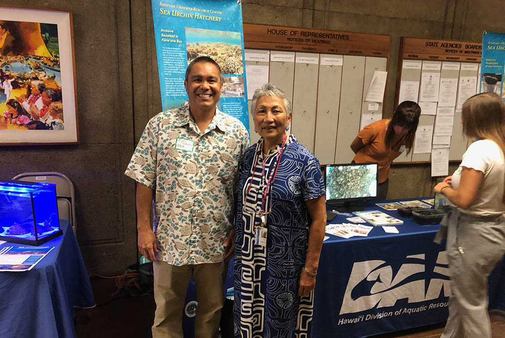 DAR staff participated in today’s Mālama Hawai‘i Mauka to Makai event at the state capitol auditorium. The event was an educational showcase of conservation programs featuring DLNR and partners, and was hosted by House Speaker Scott Saiki. Legislators had the opportunity to talk with DAR staff about various projects such as coral reef restoration and invasive species management, including sea urchin biocontrol of invasive algae.
