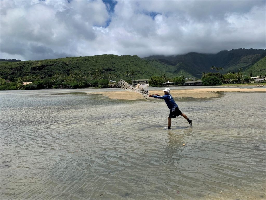 DAR technician Neal Hazama launches a cast net in Paikō Lagoon with the beautiful valley of l Kuli‘ou‘ou in the background. Since 1981 Paikō Lagoon Wildlife Sanctuary has been managed by DOFAW as a feeding and resting site for waterbirds, including ae‘o (Himantopus mexicanus knudseni) and ʻaukuʻu (Nycticorax nycticorax hoactli). Paikō Lagoon is also an important lagoonal estuary for fish in East Honolulu.
