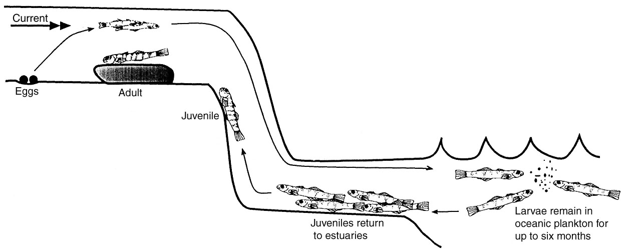 One important adaptation found in all five species of Hawaiian freshwater fishes are their amphidromous migrations (see illustration at left). Amphidromy describes a life cycle, that includes two migrations, usually one downstream and one upstream, that are not directly related to reproductive events. Larvae are washed out into the ocean right after hatching and live in the oceanic plankton for three months, or in the case of Sicyopterus stimpsoni (‘o‘opu nōpili) up to six months. Larvae (hinana) return in large numbers into the streams, often after flash floods have created large freshwater plumes that extend far into the ocean. This amphidromous life cycle is a crucial adaptation for the survival on an oceanic island where the stream environment is often subjected to catastrophic events such as hurricanes, flashfloods, and lava flows. The larvae in the ocean provide a reservoir for each species to repopulate streams after such catastrophic events. In addition, larvae are also moved by ocean currents to other streams and even islands, which ensures dispersal and maintains a complete gene pool.